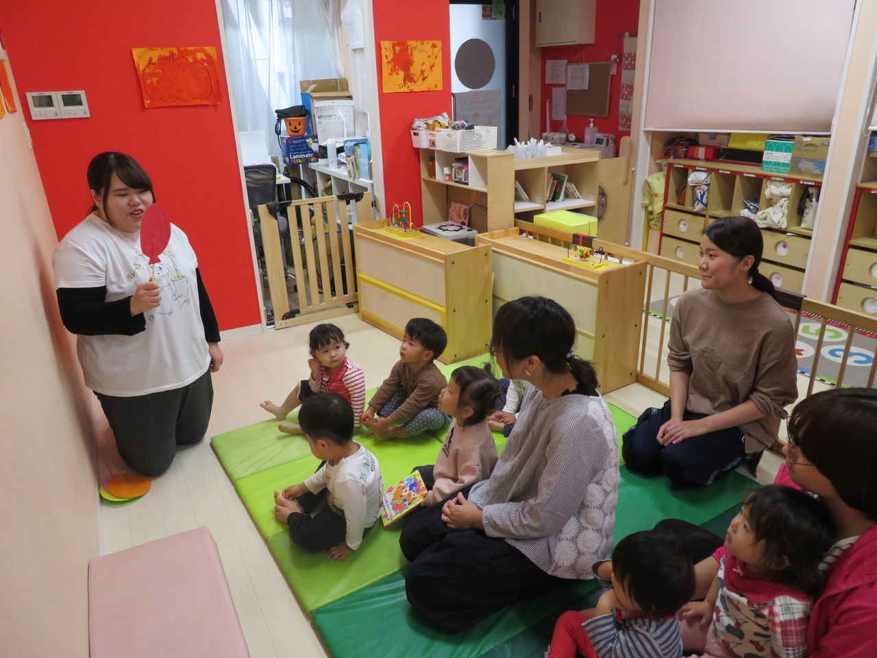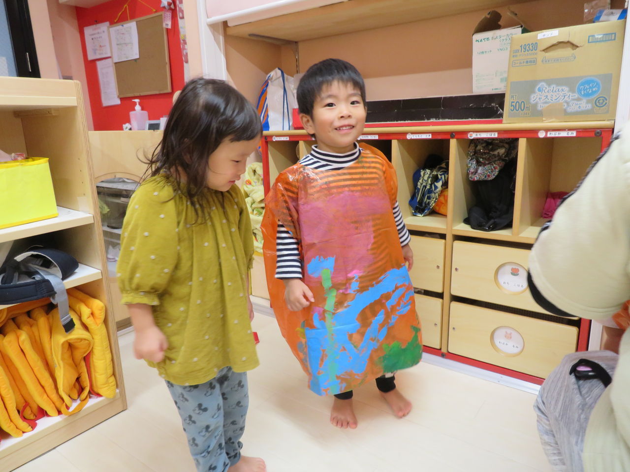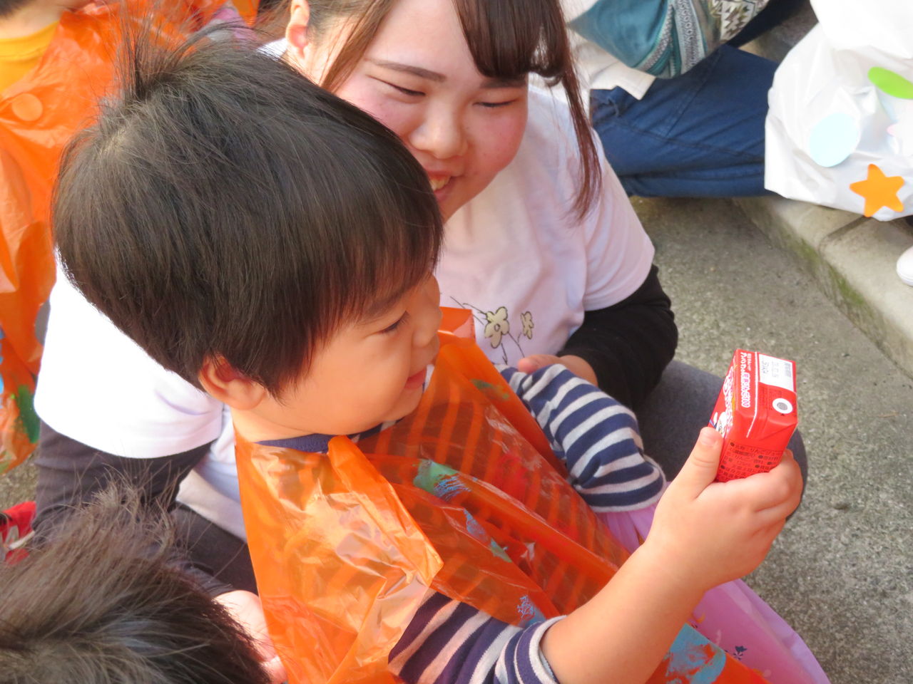 2019年10月29日 コンコンコン‥! 今日は雨だったので、お部屋でハロウィンの遊びをしましたみんなハロウィンの絵本が大好きで、絵本のキャラクターみたいに「お着換えしようか」というと「はーい!」と大喜びみんな自分で作った衣装を嬉しそうに着ていましたカバンも持って、準備万端です先生のお話もしっかりと聞いて、よーい・・・スタートみんなお家をまわり、「コンコンコン♪」とドアを叩いて「トリックオアトリート!おかしくれなきゃいたずらしちゃうぞ~」ととっても上手に言えていましたみんな一つずつ、お菓子を貰ったねお菓子を貰って、「ありがとう」も言えていえていましたハロウィン当日も楽しみだね