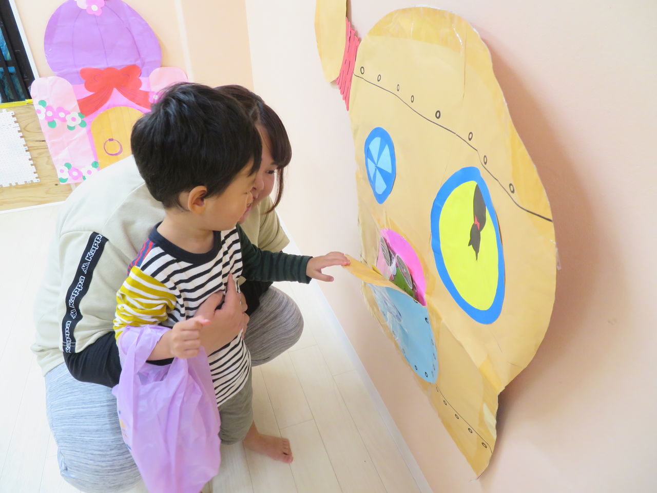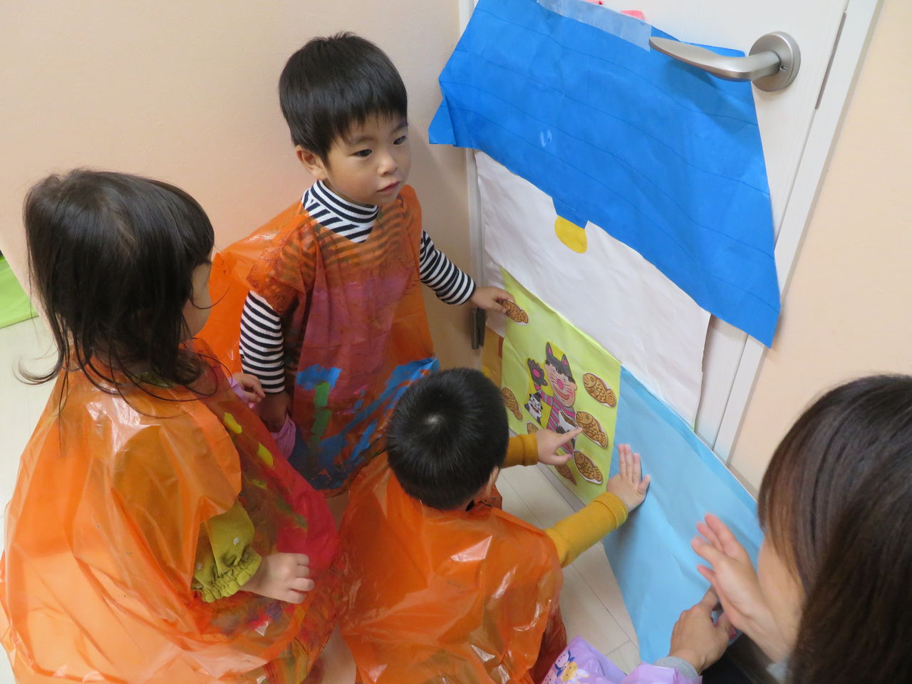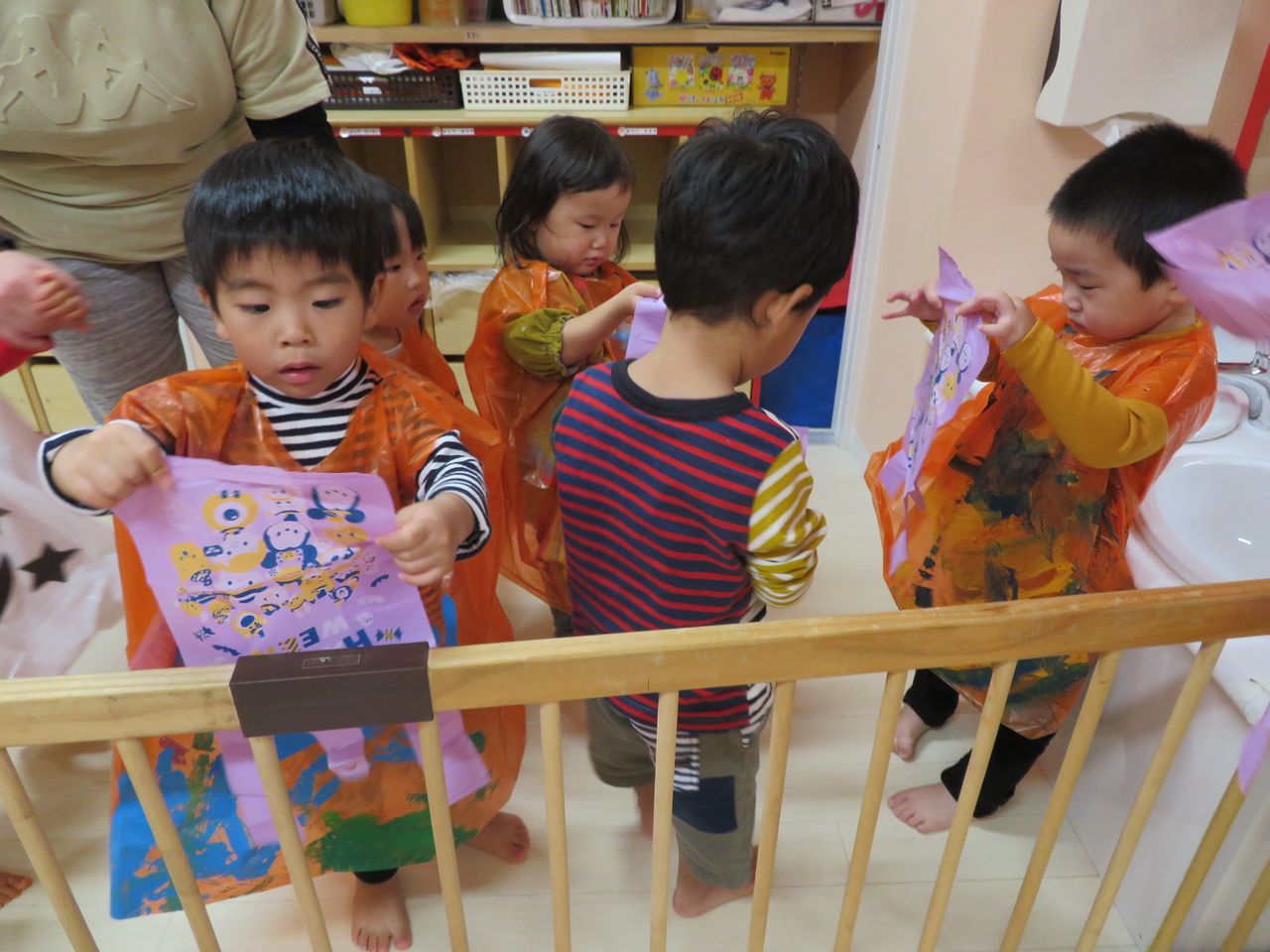 2019年10月29日 コンコンコン‥! 今日は雨だったので、お部屋でハロウィンの遊びをしましたみんなハロウィンの絵本が大好きで、絵本のキャラクターみたいに「お着換えしようか」というと「はーい!」と大喜びみんな自分で作った衣装を嬉しそうに着ていましたカバンも持って、準備万端です先生のお話もしっかりと聞いて、よーい・・・スタートみんなお家をまわり、「コンコンコン♪」とドアを叩いて「トリックオアトリート!おかしくれなきゃいたずらしちゃうぞ~」ととっても上手に言えていましたみんな一つずつ、お菓子を貰ったねお菓子を貰って、「ありがとう」も言えていえていましたハロウィン当日も楽しみだね