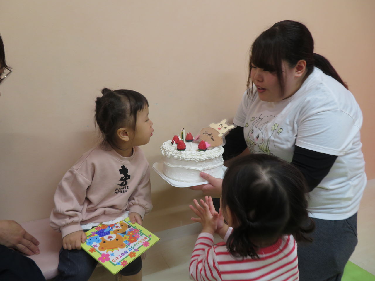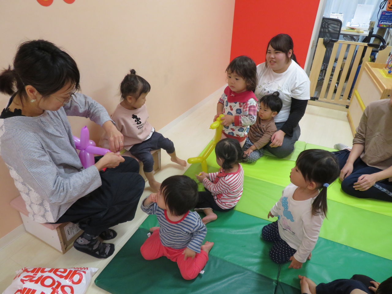 2019年10月17日 お誕生日おめでとう♪ 今日は、お友だちのお誕生日会でした先生からの出し物は、風船のペープサートでした🎈楽しかったね~ケーキも出てきてロウソクの火をフーってしたよその後は、お母さんからの出し物長い風船でいろいろなモノを作ってくれました「キリンさん!!」 「トンボさん!!」と子どもたちは大喜びでした本当にありがとうございますお昼ご飯は、お母さんと食べましたよにんじんが、お星さまになっていました☆おいしいね~とても楽しいお誕生日会になりましたねお誕生日おめでとうございます