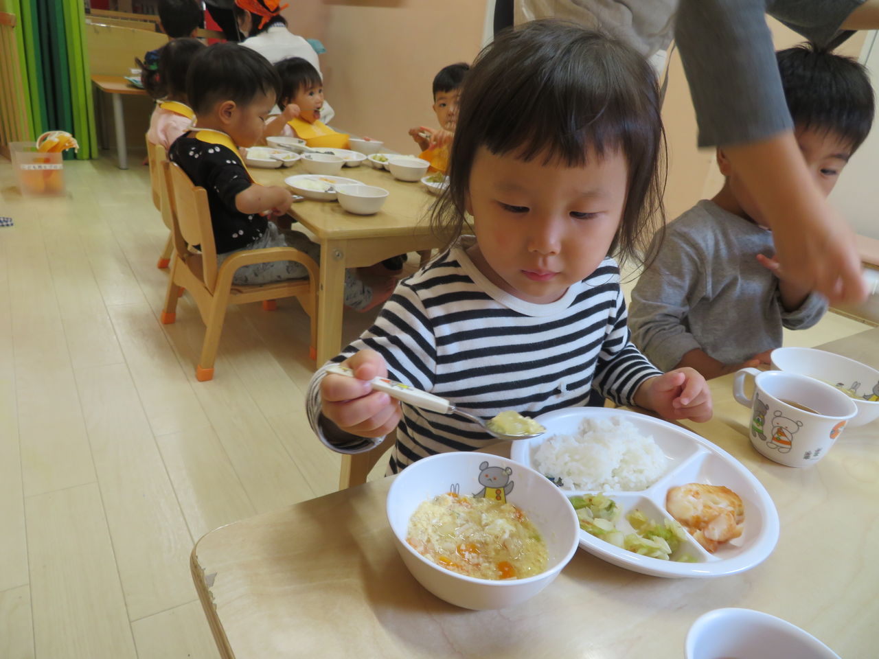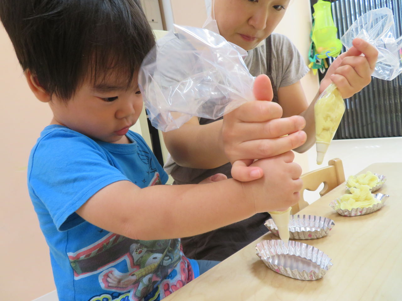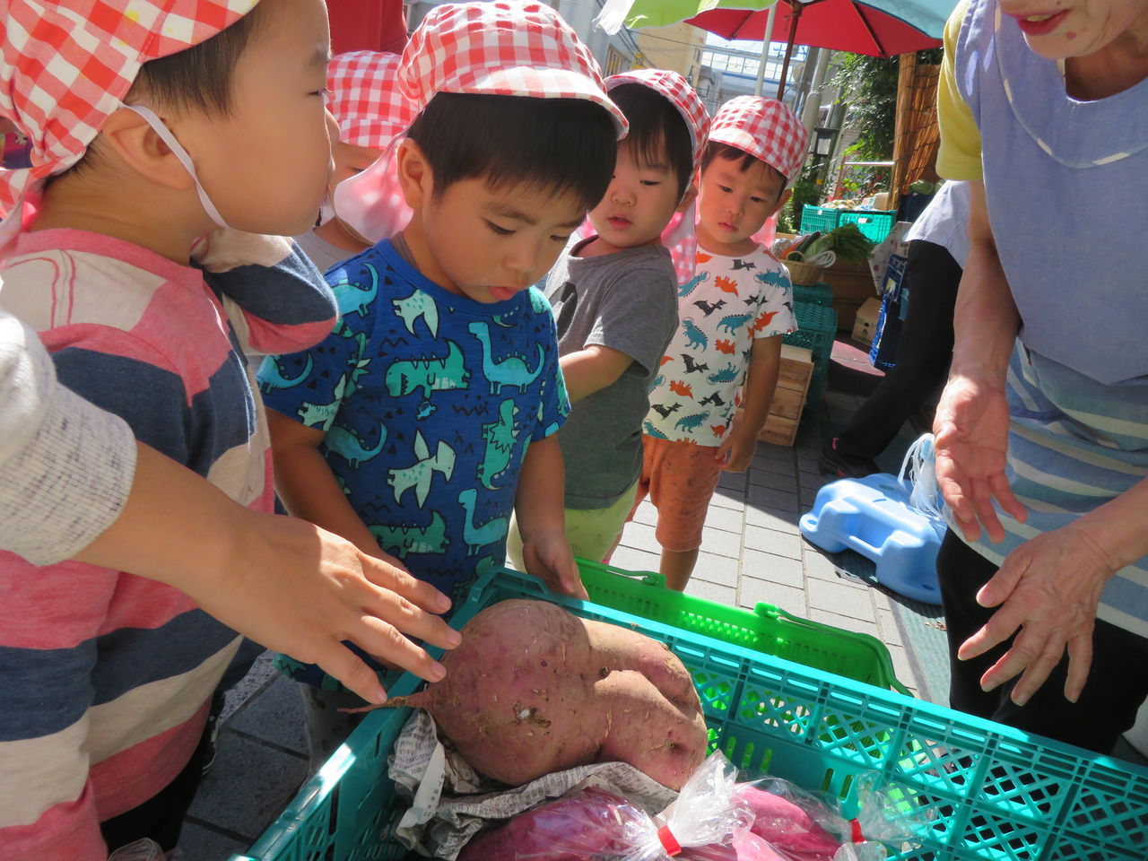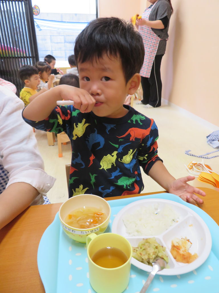 2019年10月11日 おいも 10月の食育のテーマは給食でもよくでてくるさつまいも☆昨日は近くの八百屋さんにお買い物へとりたての大きいのがあるよー!と、お店の方がみせてくれましたおっきいね~!そのお芋を使って今日はスイートポテト作りのお手伝い♪ぎゅ~~!なかなか力がいるので難しかったですがお芋が出てきた時に「できたね!!」とと喜んでいましたよ♪これを焼いてもらっておやつでいただきます☆☆