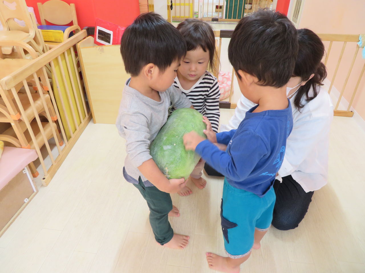 2019年10月16日 スイカかな~??? これ、何か知っていますか??これは、冬瓜っていうんです!!!!子どもたちは、「何これ!?」、「スイカかな~??」と興味津々♪触ったみたり、持ってみたりしたよ!!!お、おもい、、、、、!調理の先生に美味しくお料理してもらって、今日の給食で出してもらいました☆冬瓜あった~!!おいしいね!!と、子どもたちは大満足でした♡持ってきてくださって、本当にありがとうございました!!