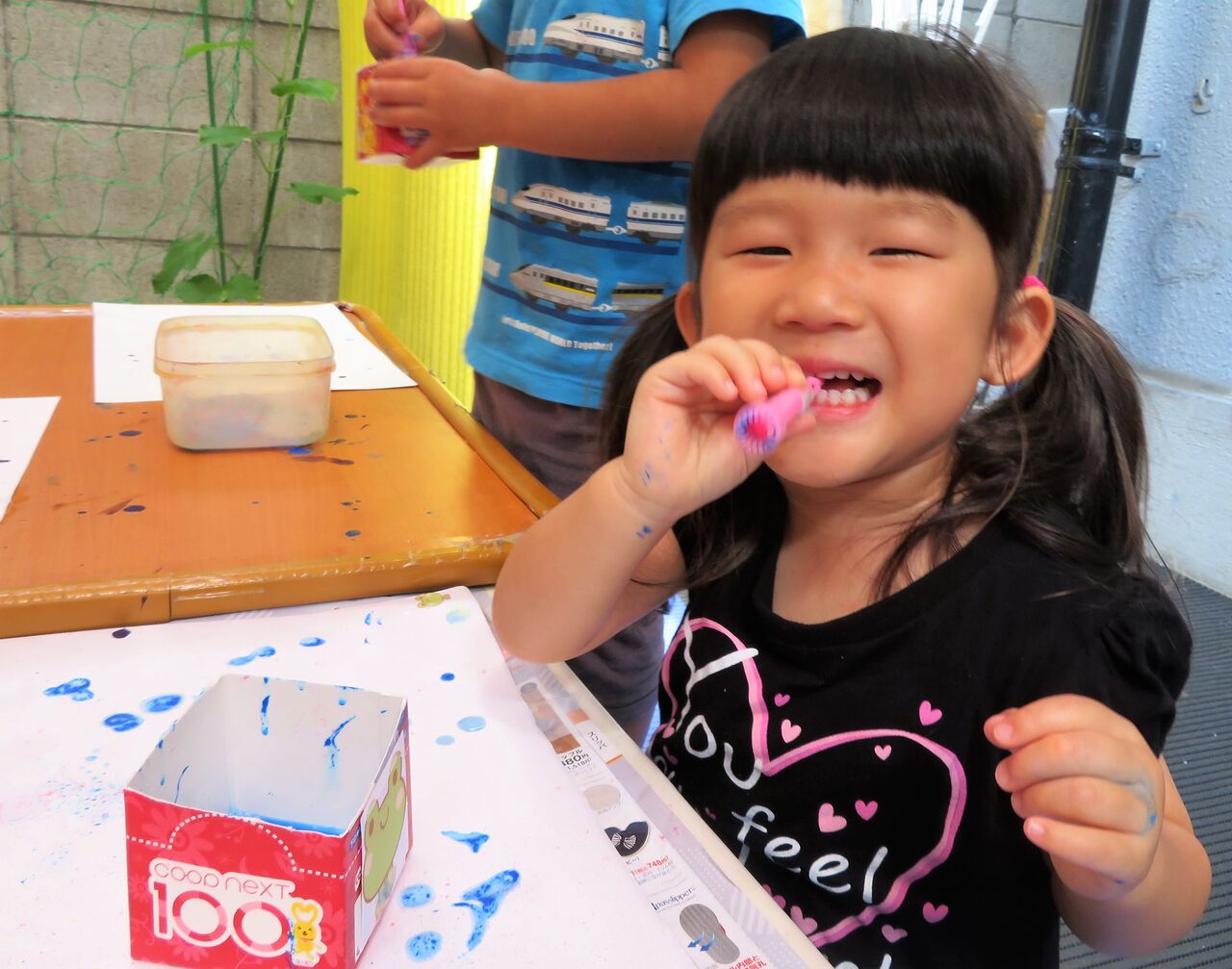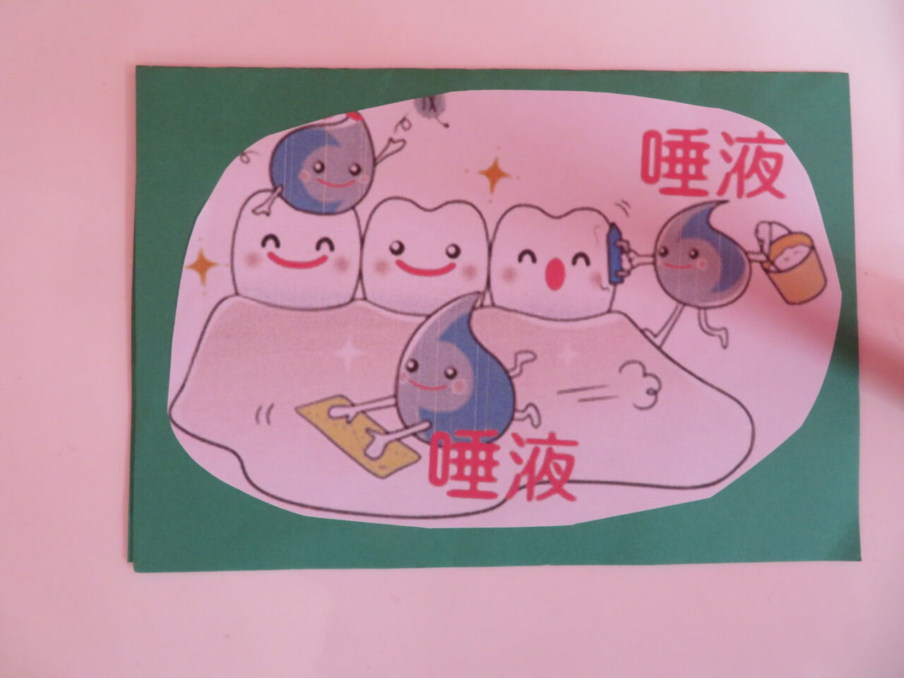 子どもたちが興味を持って楽しめるように、今回は紙芝居の他に歯ブラシで歯の汚れを落とす遊びを取り入れました。