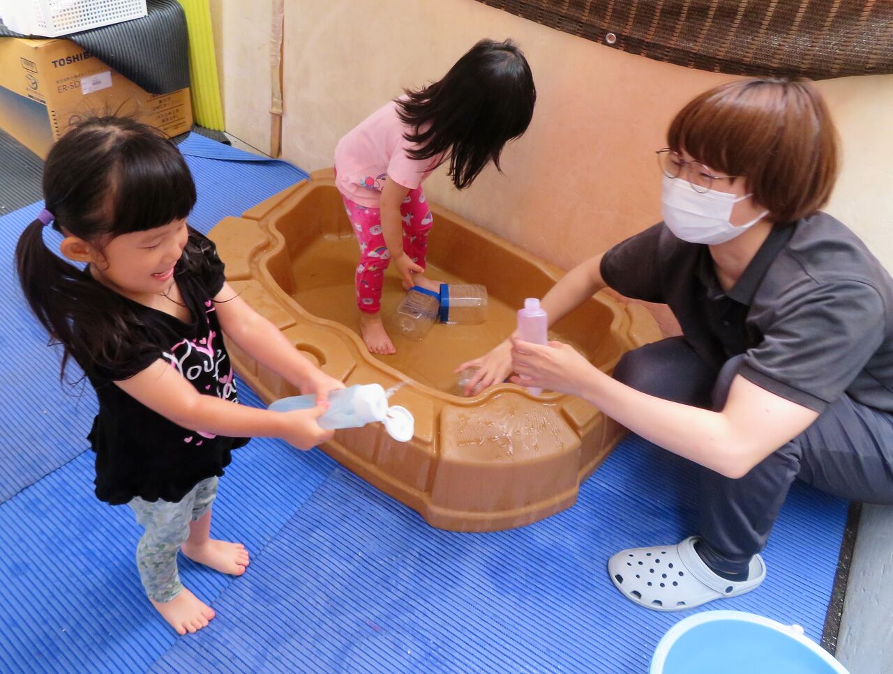 しゃぼん玉で遊んだ後は、少し水遊びもしました