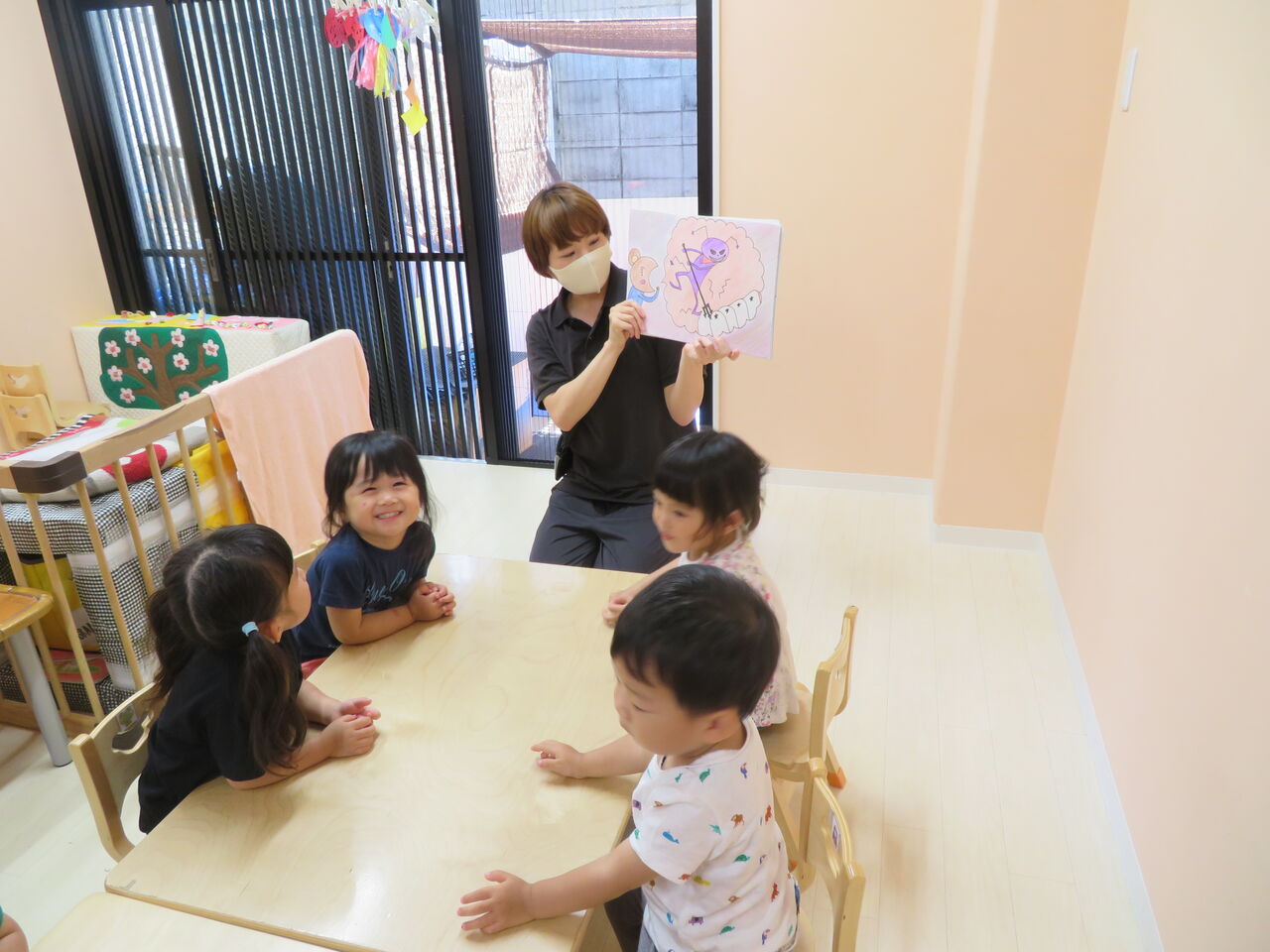 まずは「はみがきくまくん」というお話を読みました。こちらは保育者オリジナルのお話で、子どもたちもワクワクしながら見てくれていました