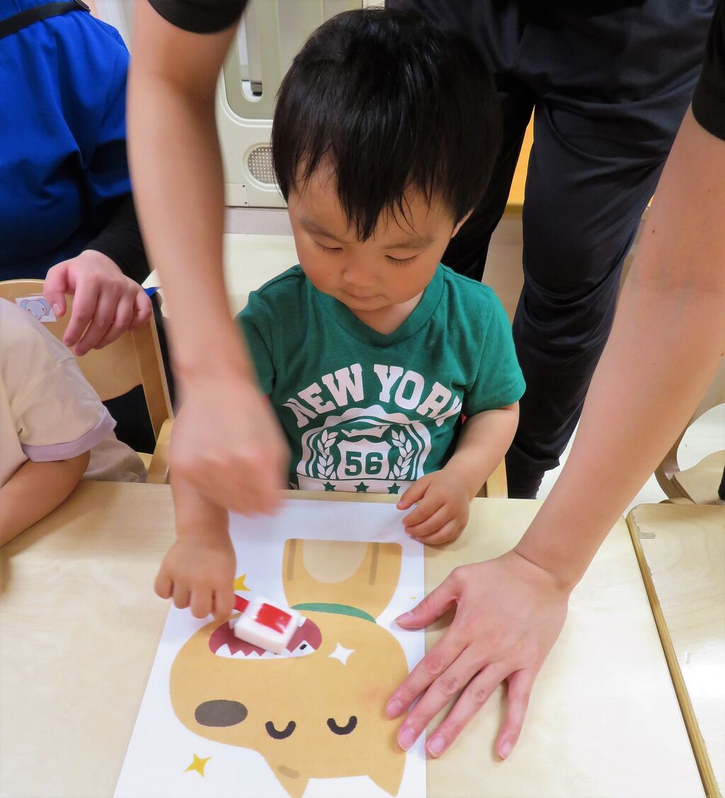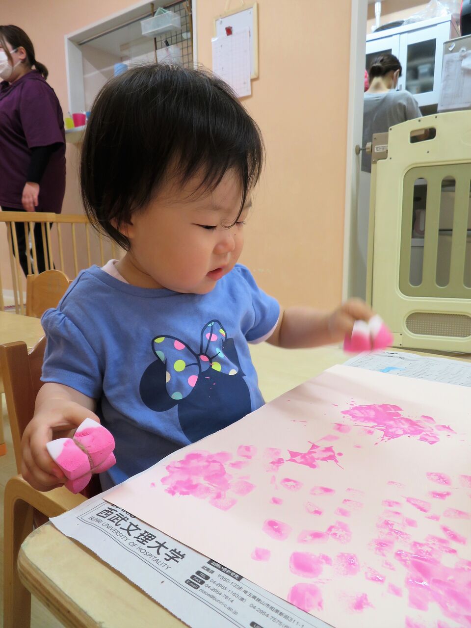 絵の具遊びが大好きな子どもたち、画用紙に嬉しそうな様子でスタンプをしています