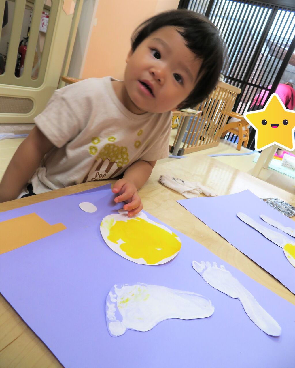 絵の具を塗って作ったお月様や、白い絵の具でとった足形を用紙に貼り付けたり・・・