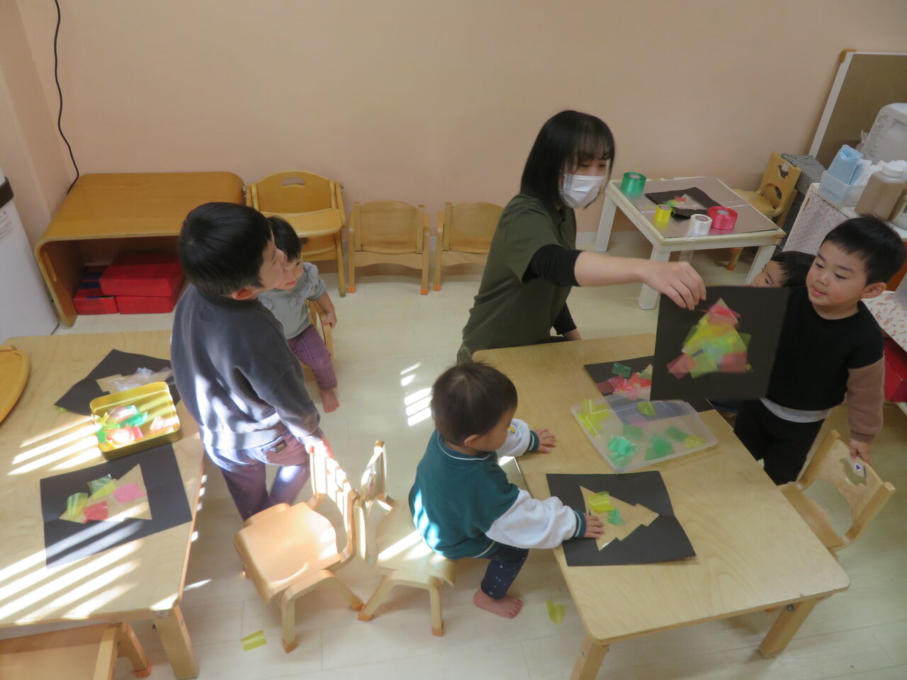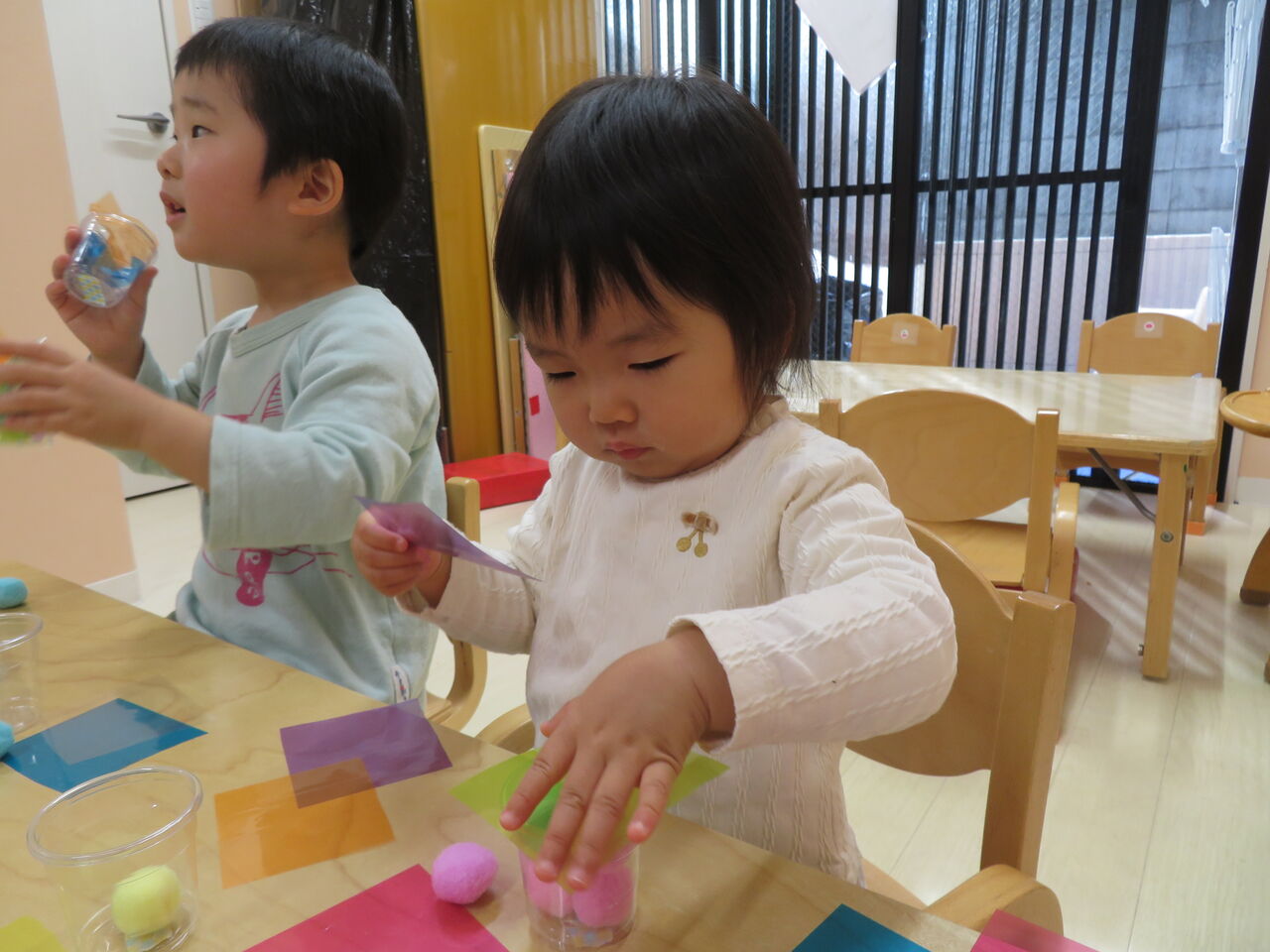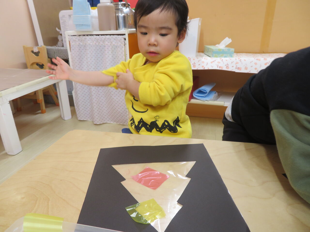 テープの部分全体に貼る子もいれば、色が重なると色が変化することに気づく子